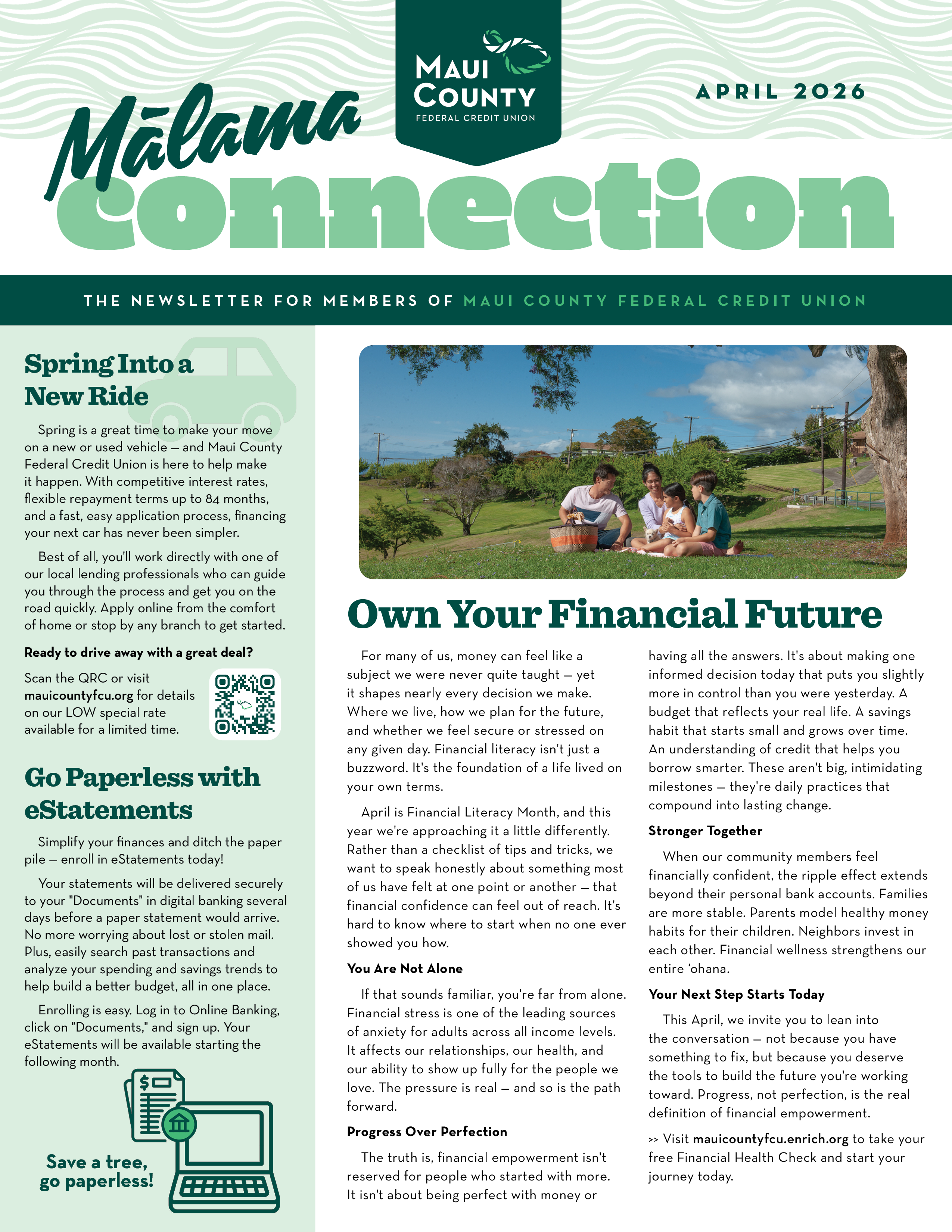 Our newsletters are packed with timely articles on financial topics, inspiring stories about your fellow members, and the latest info on credit union services and community outreach. Read everything there is to know about Maui County FCU.